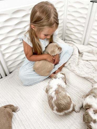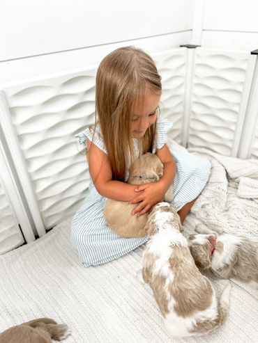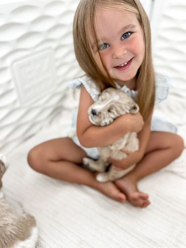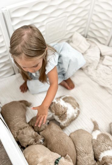 Blair made us a family of six. She is great at socializing our puppies to young children. She is four years old and spends more time with our puppies than anyone besides Suzanne.